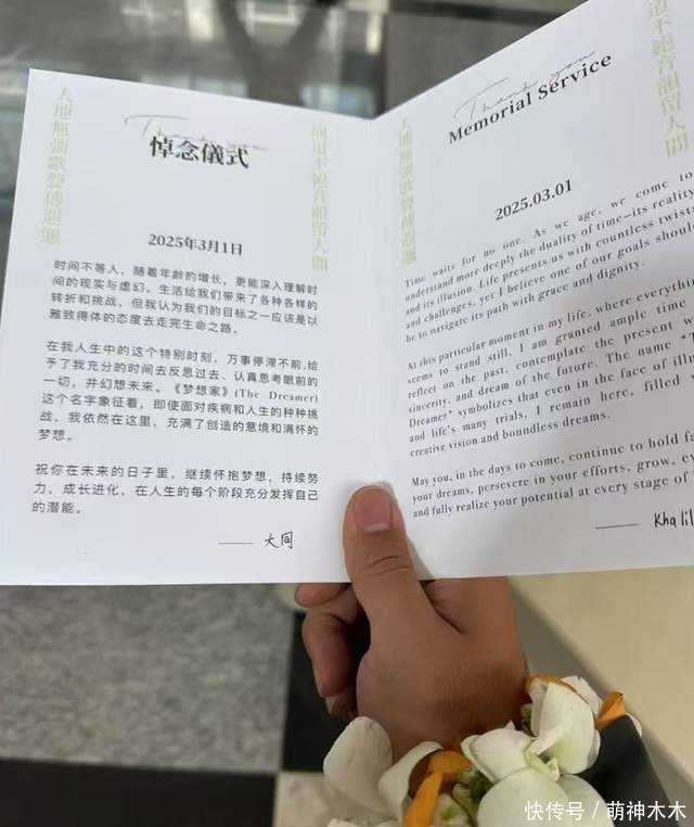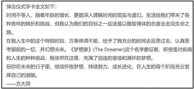随后有媒体报道称,3月1日,方大同葬礼已举办完成。悼念仪式手卡公布了方大同留下最后的话,令人热泪。